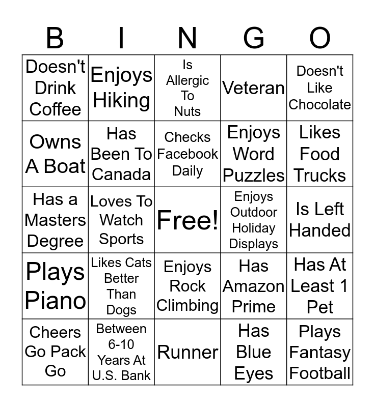 This bingo card has a free space and 24 words: Likes Cats Better Than Dogs, Between 6-10 Years At U.S. Bank, Checks Facebook Daily, Cheers Go Pack Go, Doesn't Like Chocolate, Doesn't Drink Coffee, Owns A Boat, Enjoys Hiking, Enjoys Outdoor Holiday Displays, Enjoys Rock Climbing, Enjoys Word Puzzles, Has a Masters Degree, Has Amazon Prime, Has At Least 1 Pet, Has Been To Canada, Has Blue Eyes, Is Left Handed, Is Allergic To Nuts, Likes Food Trucks, Loves To Watch Sports, Plays Fantasy Football, Plays Piano, Veteran and Runner.