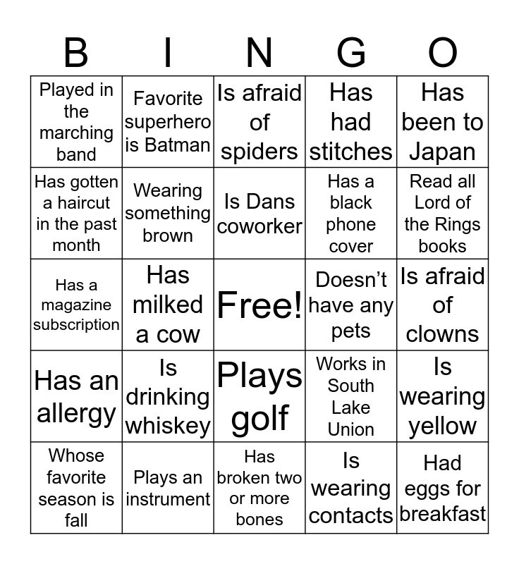 This bingo card has a free space and 59 words: Wears the same shoe size as you, Plays an instrument, Born in another state, Has an allergy, Is wearing contacts, Doesn’t have siblings, Wearing something brown, Has a cat, Has a black phone cover, Knows what new Zealands nation fruit is, Has had stitches, Has fainted or thrown up in public, Has gotten a haircut in the past month, Was born in July, Failed their first driving test, Played in the marching band, Had eggs for breakfast, Has been to Japan, Is pregnant with Dans baby, Is Dans coworker, Doesn’t have any pets, Is afraid of spiders, Whose favorite season is fall, Is wearing yellow, Has a tattoo, Favorite video game is COD, Is CPR certified, Works in sales, Read all Lord of the Rings books, Can name five Pokemon, Plays tennis, Picked Duke to win their bracket, Not a Seahawks fan, Owns a Toyota, Favorite superhero is Batman, Doesn’t drink coffee, Can touch their toes without bending knees, Has milked a cow, Has been to a Broadway musical, Has a magazine subscription, Is wearing multi colored bright socks, Is drinking whiskey, Is afraid of clowns, Watches GOT, Has a graduate degree, Speaks another language, Knows how to sew, Has changed a tire, Plays golf, Has broken two or more bones, Has a green toothbrush, Has a birthday this month, Has gone skydiving, Was alive when Kennedy was assasinated, Is not on Facebook, Works in South Lake Union, Has done the Seattle Underground tour, Has season passes to a Seattle sports team and Is currently enrolled in a class.