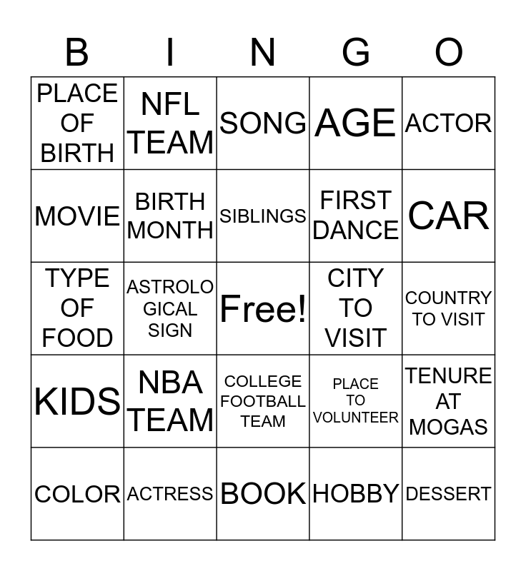 This bingo card has a free space and 24 words: COLOR, NBA TEAM, SIBLINGS, HOBBY, ACTOR, PLACE OF BIRTH, NFL TEAM, SONG, CITY TO VISIT, COUNTRY TO VISIT, TYPE OF FOOD, BIRTH MONTH, PLACE TO VOLUNTEER, TENURE AT MOGAS, MOVIE, ACTRESS, BOOK, AGE, CAR, KIDS, ASTROLO GICAL SIGN, COLLEGE FOOTBALL TEAM, FIRST DANCE and DESSERT.
