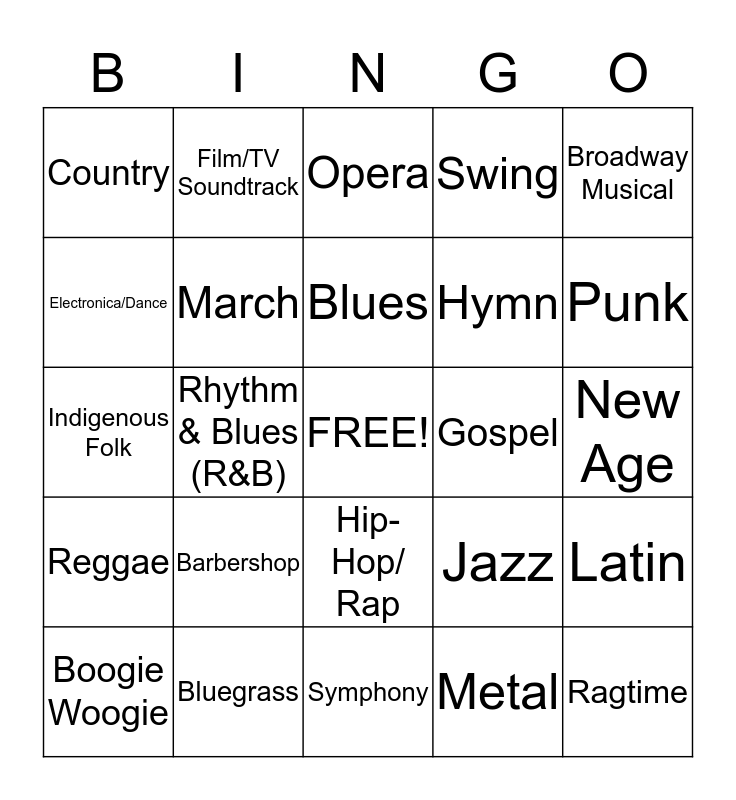 This bingo card has a free space and 24 words: Barbershop, Bluegrass, Blues, Boogie Woogie, Broadway Musical, Country, Electronica/Dance, Film/TV Soundtrack, Gospel, Hip-Hop/ Rap, Hymn, Indigenous Folk, Jazz, Latin, March, Metal, New Age, Opera, Punk, Rhythm & Blues (R&B), Ragtime, Reggae, Swing and Symphony.