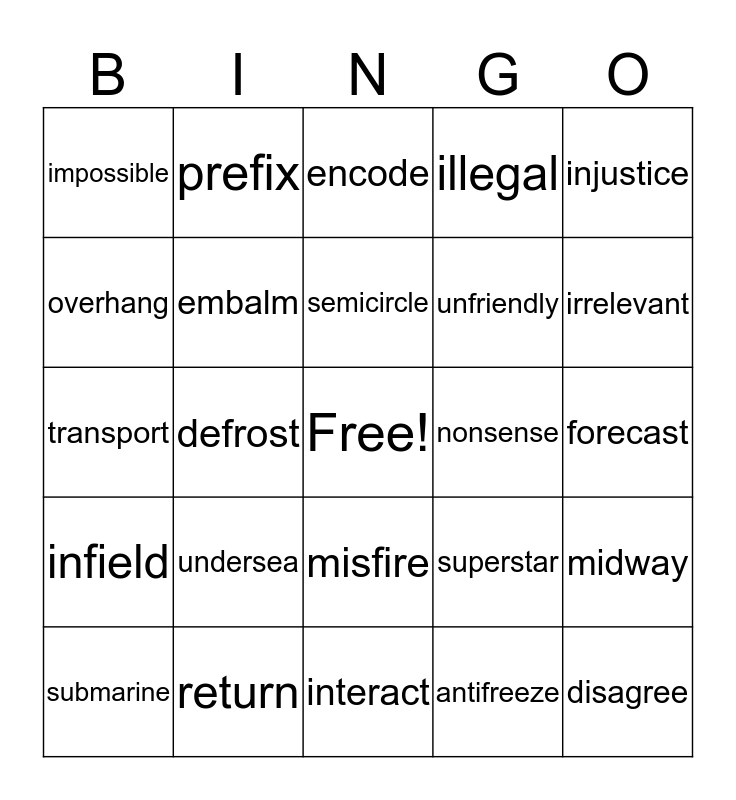 This bingo card has a free space and 24 words: undersea, return, semicircle, submarine, injustice, impossible, overhang, prefix, nonsense, misfire, unfriendly, transport, superstar, midway, embalm, antifreeze, forecast, encode, irrelevant, defrost, disagree, infield, illegal and interact.