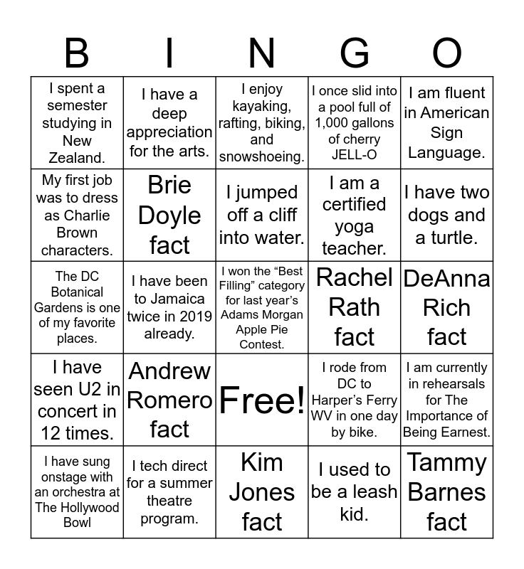 This bingo card has 26 words: Free!, I used to be a leash kid., I jumped off a cliff into water., I tech direct for a summer theatre program., I am fluent in American Sign Language., I spent a semester studying in New Zealand., My first job was to dress as Charlie Brown characters., I have a deep appreciation for the arts., DeAnna Rich fact, I rode from DC to Harper’s Ferry WV in one day by bike., I am a certified yoga teacher., The DC Botanical Gardens is one of my favorite places., I am currently in rehearsals for The Importance of Being Earnest., I have sung onstage with an orchestra at The Hollywood Bowl, I have been to Jamaica twice in 2019 already., I once won $100 of the back of a box of Captain Crunch, I once slid into a pool full of 1,000 gallons of cherry JELL-O, I have seen U2 in concert in 12 times., I enjoy kayaking, rafting, biking, and snowshoeing., I won the “Best Filling” category for last year’s Adams Morgan Apple Pie Contest., I have two dogs and a turtle., Kim Jones fact, Rachel Rath fact, Andrew Romero fact, Brie Doyle fact and Tammy Barnes fact.