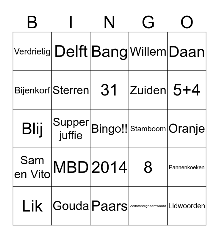 This bingo card has a free space and 30 words: Gouda, Groen, Supper juffie, Noorden, Verdrietig, Bang, Sterren, 2014, Stamboom, Paars, Oranje, Lidwoorden, Zelfstandignaamwoord, 5+5, 5+4, 25, 8, Sam en Vito, MBD, Daan, Blij, Boos, Delft, Zuiden, Bijenkorf, Willem, Pannenkoeken, Lik, 31 and Krimpen.