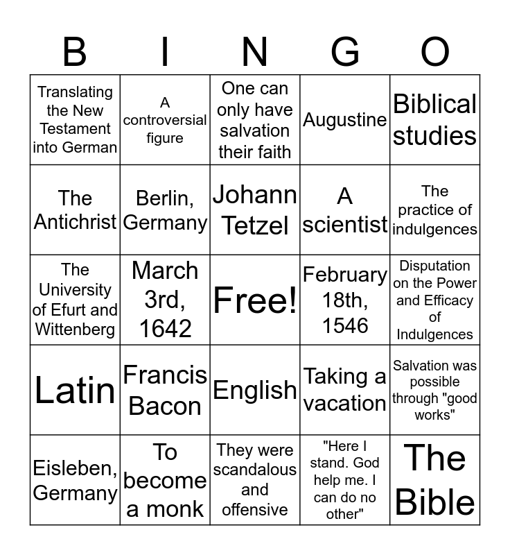 This bingo card has a free space and 24 words: Eisleben, Germany, Francis Bacon, Johann Tetzel, "Here I stand. God help me. I can do no other", Biblical studies, Translating the New Testament into German, A controversial figure, One can only have salvation their faith, February 18th, 1546, Disputation on the Power and Efficacy of Indulgences, The University of Efurt and Wittenberg, Berlin, Germany, Taking a vacation, Salvation was possible through "good works", The Antichrist, To become a monk, They were scandalous and offensive, Augustine, The practice of indulgences, Latin, March 3rd, 1642, English, A scientist and The Bible.