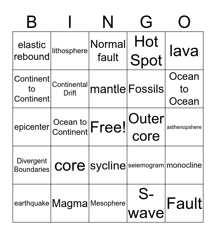This bingo card has a free space and 44 words: crust, core, crust, S-wave, P-WAve, focus, Continental Drift, seismic wave, Hot Spot, Fault, elastic rebound, Magma, seiemogram, asthenopshere, surface waves, Alfred Wegener, Mesophere, Outer core, anticline, epicenter, lithosphere, sycline, folding, lava, tension, slip fault, mantle, deformation, monocline, earthquake, volcanoes, Normal fault, reverse fault, Convergent Boundaries, Divergent Boundaries, Ring of Fire, Sea Floor Spreading, Mid-Ocean Rift, Ocean to Ocean, Continent to Continent, Ocean to Continent, Glacier Groves, Fossils and Puzzle Pieces.