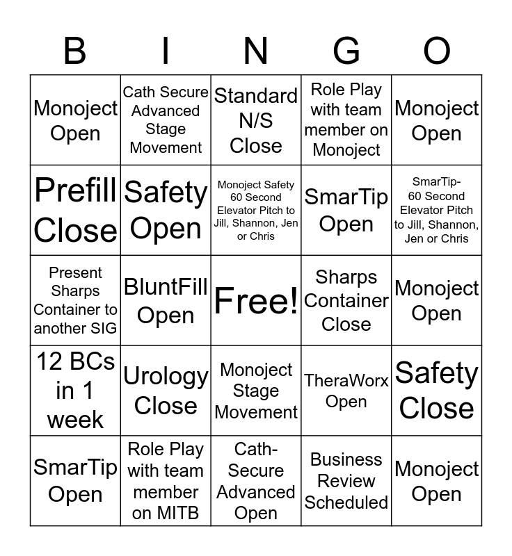 This bingo card has a free space and 24 words: Urology Close, Role Play with team member on MITB, Monoject Safety 60 Second Elevator Pitch to Jill, Shannon, Jen or Chris, SmarTip Open, Monoject Open, Monoject Open, Prefill Close, Cath Secure Advanced Stage Movement, Sharps Container Close, Monoject Stage Movement, SmarTip Open, Present Sharps Container to another SIG, TheraWorx Open, Safety Close, Safety Open, Business Review Scheduled, Monoject Open, Standard N/S Close, SmarTip- 60 Second Elevator Pitch to Jill, Shannon, Jen or Chris, BluntFill Open, Monoject Open, 12 BCs in 1 week, Role Play with team member on Monoject and Cath-Secure Advanced Open.