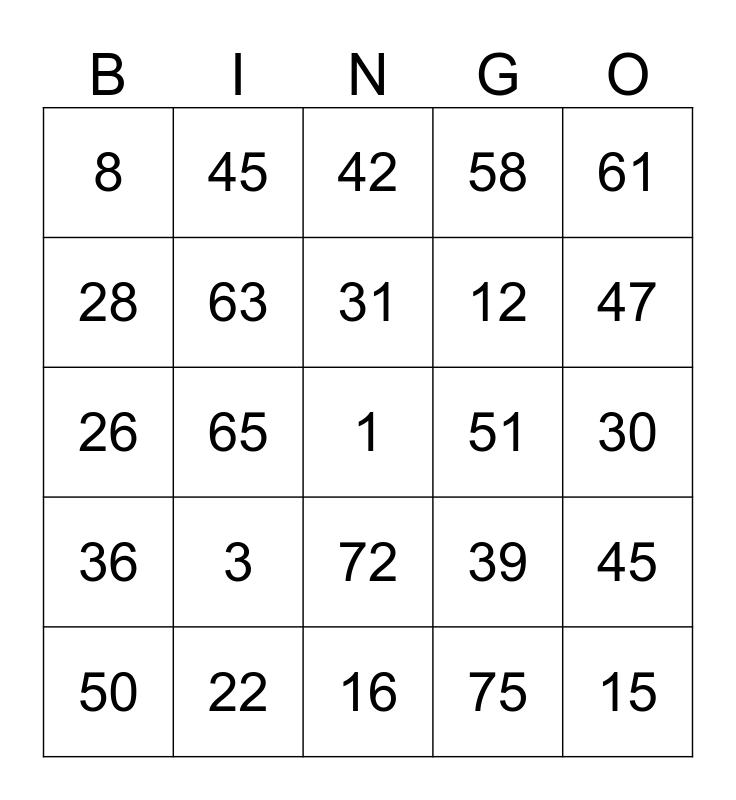 This bingo card has 25 words: 3, 16, 31, 50, 61, 8, 28, 45, 51, 72, 12, 26, 39, 45, 63, 15, 30, 42, 47, 65, 1, 22, 36, 58 and 75.