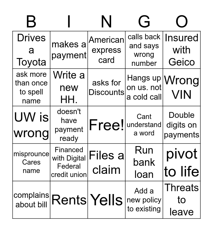 This bingo card has a free space and 24 words: Financed with Digital Federal credit union, Rents, asks for Discounts, complains about bill, Insured with Geico, Drives a Toyota, ask more than once to spell name, makes a payment, Cant understand a word, Files a claim, Hangs up on us. not a cold call, UW is wrong, Run bank loan, pivot to life, Write a new HH., Add a new policy to existing, Double digits on payments, American express card, Wrong VIN, doesn't have payment ready, Threats to leave, misprounce Cares name, calls back and says wrong number and Yells.