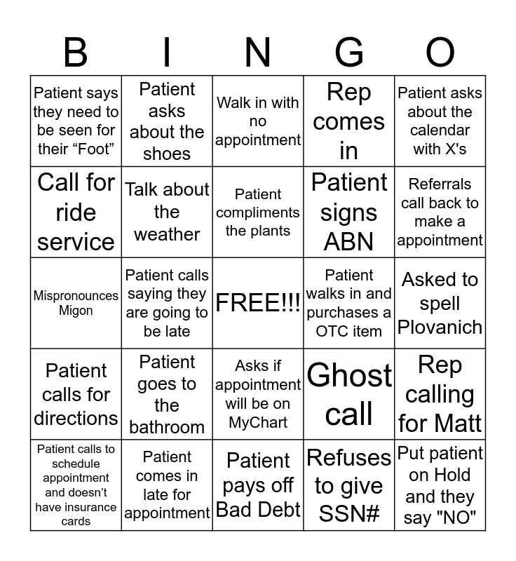 This bingo card has a free space and 24 words: Patient calls to schedule appointment and doesn’t have insurance cards, Patient goes to the bathroom, Patient compliments the plants, Refuses to give SSN#, Patient asks about the calendar with X's, Patient says they need to be seen for their “Foot”, Patient asks about the shoes, Walk in with no appointment, Patient walks in and purchases a OTC item, Asked to spell Plovanich, Mispronounces Migon, Talk about the weather, Ghost call, Rep calling for Matt, Call for ride service, Patient comes in late for appointment, Patient pays off Bad Debt, Rep comes in, Referrals call back to make a appointment, Patient calls for directions, Patient calls saying they are going to be late, Asks if appointment will be on MyChart, Patient signs ABN and Put patient on Hold and they say "NO".