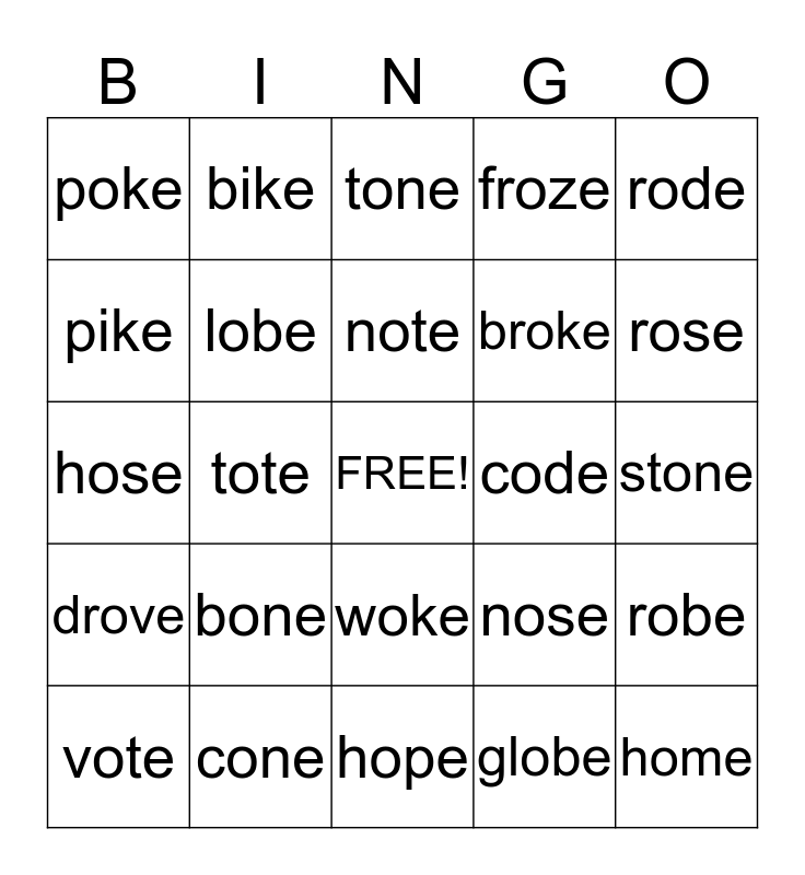 This bingo card has a free space and 24 words: bone, cone, note, vote, rode, poke, pike, bike, code, woke, broke, hose, nose, robe, lobe, globe, stone, tone, rose, tote, home, drove, froze and hope.