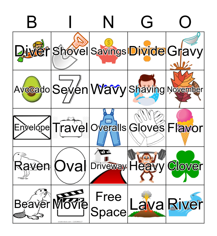 This bingo card has 23 images, a free space and 24 words: Oval, Movie, Wavy, Beaver, Gravy, Diver, Avocado, Shovel, Gloves, Driveway, Shaving, Envelope, Heavy, Clover, Seven, Lava, Flavor, Savings, November, Travel, River, Raven, Divide and Free Space.