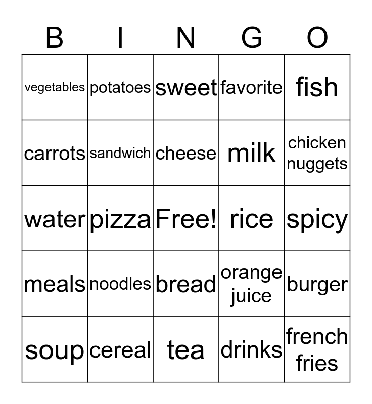 This bingo card has a free space and 24 words: noodles, cereal, cheese, soup, fish, vegetables, carrots, potatoes, rice, bread, milk, water, orange juice, burger, sandwich, drinks, spicy, sweet, chicken nuggets, pizza, french fries, meals, favorite and tea.