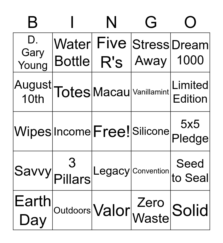 This bingo card has a free space and 34 words: 25 Years, Zero Waste, University Scholarship, Australian, Savvy, Totes, Dream 1000, Earth Day, Water Bottle, Royal, Macau, Five R's, Young Living Foundation, Clean Beauty, Silicone, Limited Edition, Outdoors, Wipes, 3 Pillars, Convention, Legacy, Steward- ship, D. Gary Young, 5x5 Pledge, Valor, Solid, Stress Away, Lavender, Vanillamint, August 10th, iTovi, Income, Seed to Seal and Young Living.