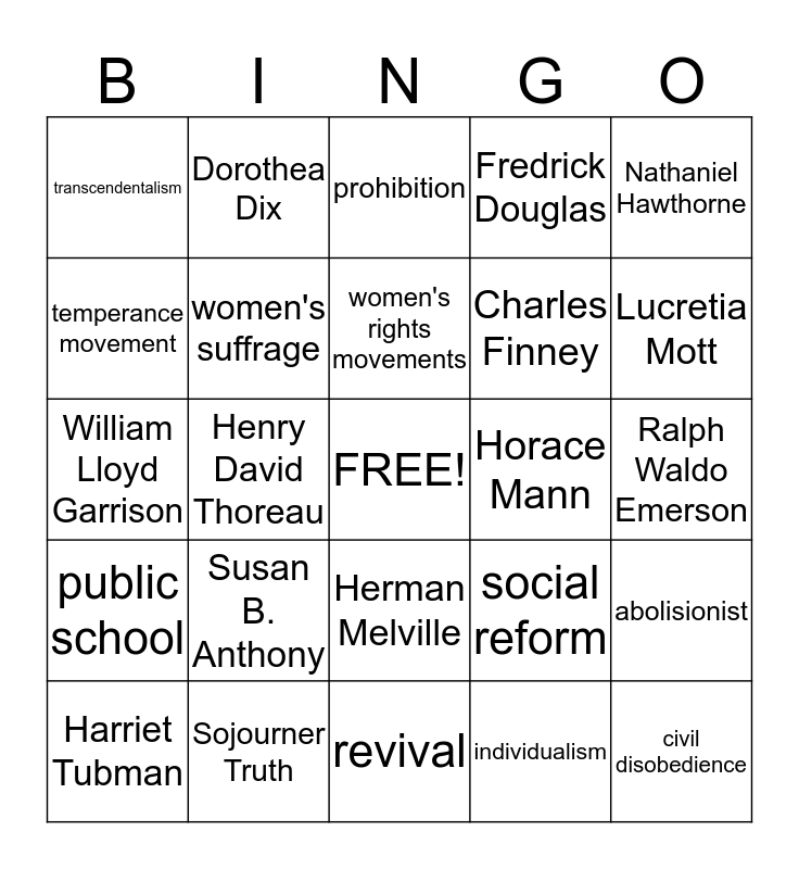 This bingo card has a free space and 27 words: social reform, predestination, Charles Finney, revival, temperance movement, prohibition, Dorothea Dix, public school, Horace Mann, abolisionist, William Lloyd Garrison, Fredrick Douglas, Harriet Tubman, Sojourner Truth, Lucretia Mott, Elizabeth Cady Stanton, women's suffrage, women's rights movements, Susan B. Anthony, transcendentalism, Ralph Waldo Emerson, individualism, Henry David Thoreau, civil disobedience, Herman Melville, Nathaniel Hawthorne and Louisa May Alcott.