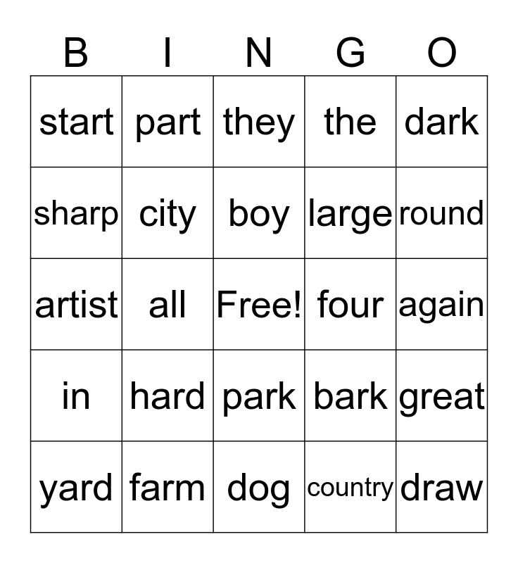This bingo card has a free space and 24 words: hard, farm, boy, yard, dark, start, sharp, part, four, park, large, artist, bark, great, city, country, again, they, round, all, draw, in, the and dog.