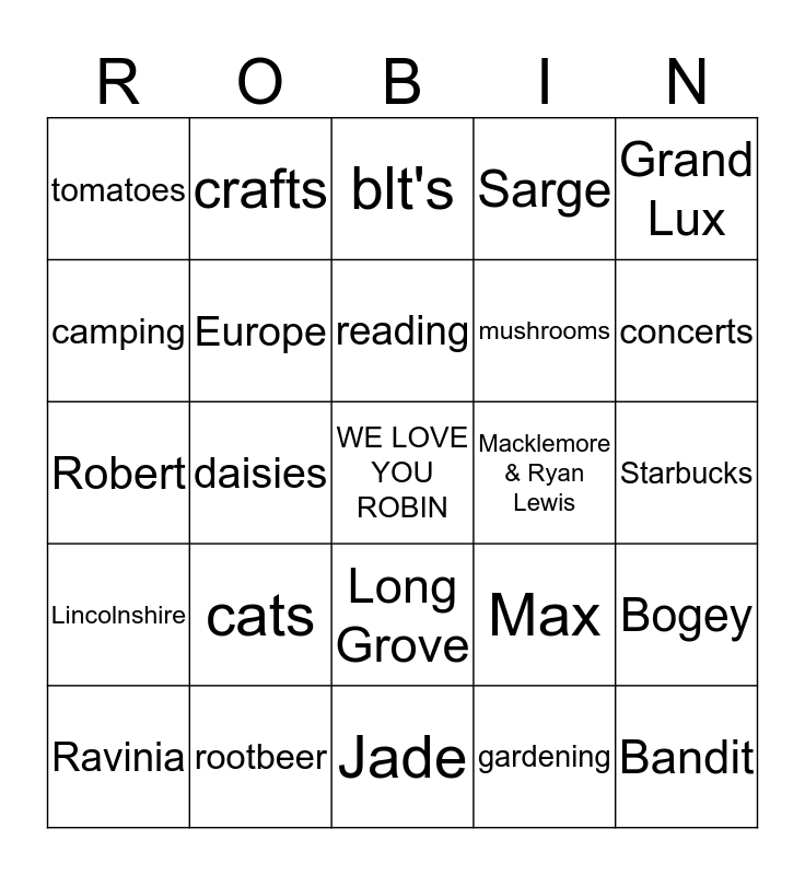 This bingo card has a free space and 46 words: Girl Scouts, Bandit, Pink, Jade, cats, dogs, crafts, angel food cake, camping, New Hampshire, Europe, Sarge, Bogey, Max, 50, family, reading, Macklemore & Ryan Lewis, Western University, Grand Lux, daisies, gardening, tomatoes, mushrooms, dancing, concerts, Ravinia, Arizona, Long Grove, Lincolnshire, choco strawberries, Cookie Monster, baking, choco chip cookies, black licorice, rootbeer, Starbucks, tea, movies, popcorn, Red Robin, blt's, Robert, Megan, Dan and Tweet.