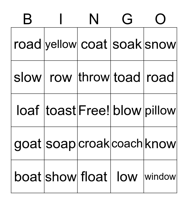 This bingo card has a free space and 24 words: boat, soap, throw, low, snow, road, yellow, coat, blow, pillow, loaf, row, coach, know, slow, show, float, soak, road, goat, toast, croak, toad and window.
