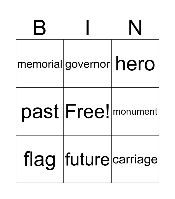 This bingo card has a free space and 9 words: flag, hero, governor, past, memorial, monument, carriage, present and future.