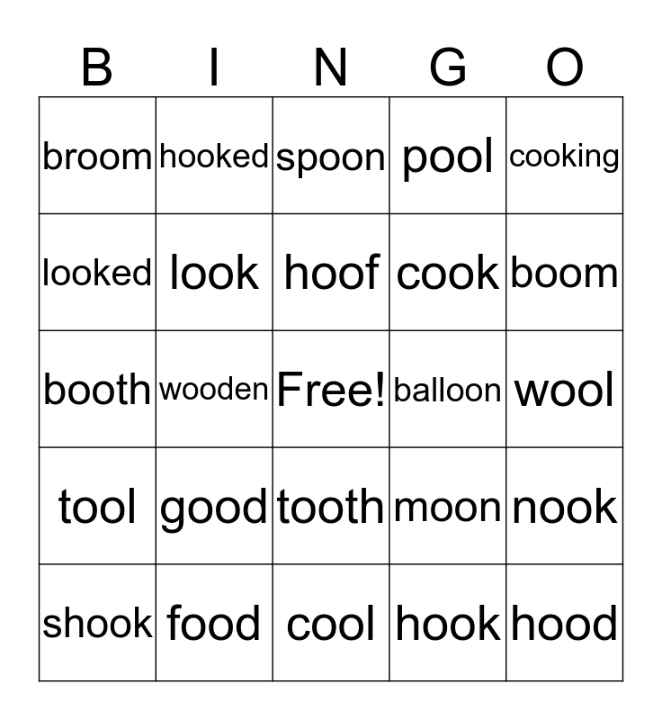 This bingo card has a free space and 29 words: shook, wood, wooden, stood, broom, spoon, look, good, balloon, food, wool, hood, cool, hook, boom, toot, tooth, tool, cooking, booth, moon, zoom, cook, looked, pool, hooked, nook, hoof and bloom.