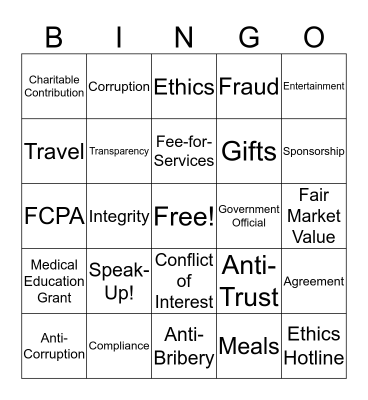 This bingo card has a free space and 24 words: Speak-Up!, Compliance, Fee-for-Services, Anti-Corruption, Entertainment, Charitable Contribution, Travel, Corruption, Government Official, Conflict of Interest, Gifts, FCPA, Anti-Trust, Agreement, Transparency, Meals, Fair Market Value, Ethics, Sponsorship, Integrity, Ethics Hotline, Medical Education Grant, Fraud and Anti-Bribery.