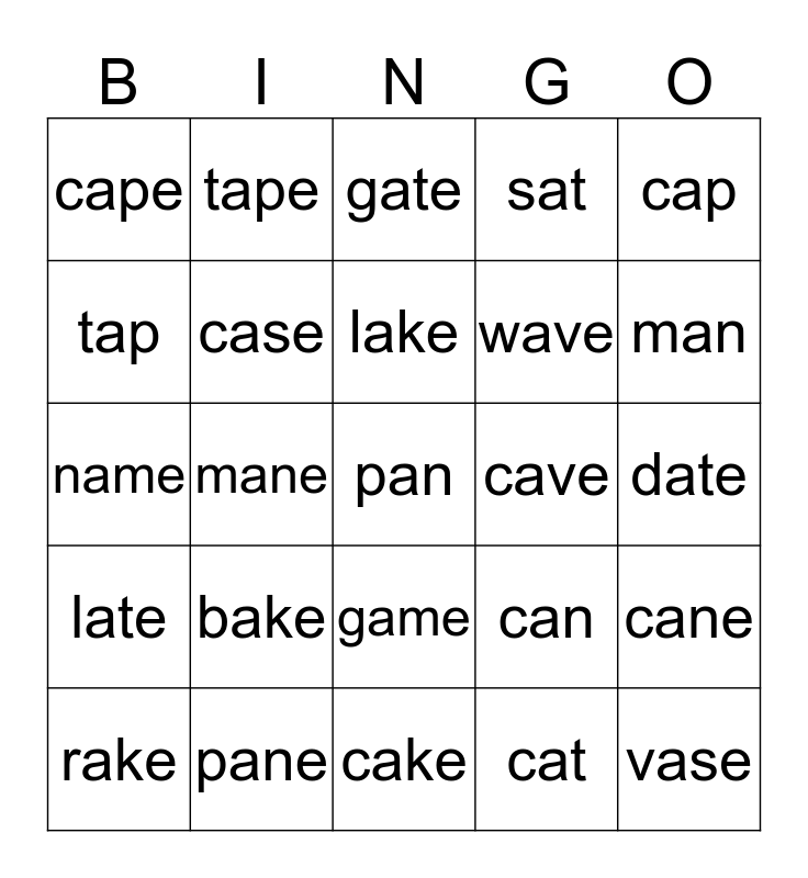 This bingo card has 25 words: bake, cake, lake, rake, cap, cape, tap, tape, cave, game, wave, name, can, cane, case, vase, date, gate, man, mane, pan, pane, late, sat and cat.