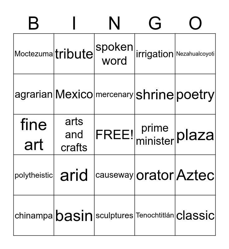 This bingo card has a free space and 24 words: arid, basin, mercenary, chinampa, Nezahualcoyoti, Moctezuma, agrarian, tribute, prime minister, causeway, shrine, fine art, orator, Aztec, Mexico, Tenochtitlán, plaza, spoken word, poetry, arts and crafts, classic, polytheistic, irrigation and sculptures.