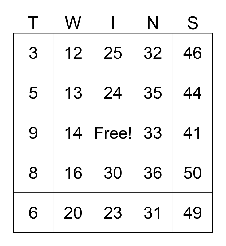 This bingo card has a free space and 51 words: 1, 11, 21, 31, 41, 2, 12, 22, 32, 42, 3, 13, 23, 33, 43, 4, 14, 24, 34, 44, 5, 15, 25, 35, 45, 6, 16, 26, 36, 46, 7, 17, 27, 37, 47, 8, 18, 28, 38, 48, 9, 19, 29, 39, 49, 10, 20, 30, 40, 50 and 52.