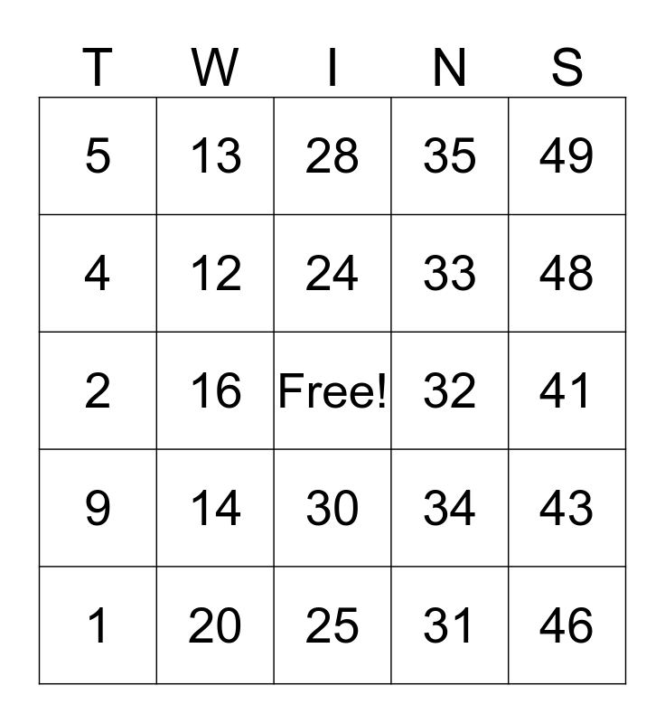 This bingo card has a free space and 45 words: 6, 16, 26, 36, 46, 3, 13, 23, 33, 43, 4, 14, 24, 34, 44, 8, 18, 28, 38, 48, 5, 15, 25, 35, 45, 1, 11, 21, 31, 41, 10, 20, 30, 40, 50, 9, 19, 29, 39, 49, 2, 12, 22, 32 and 42.