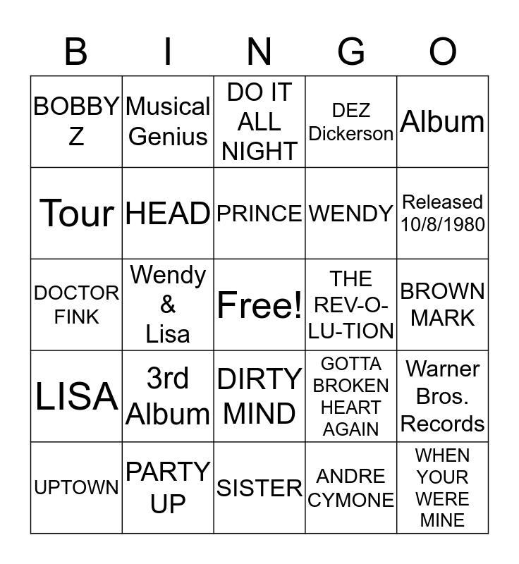 This bingo card has a free space and 24 words: UPTOWN, 3rd Album, PRINCE, ANDRE CYMONE, Album, BOBBY Z, Musical Genius, DO IT ALL NIGHT, THE REV-O- LU-TION, BROWN MARK, DOCTOR FINK, HEAD, GOTTA BROKEN HEART AGAIN, Warner Bros. Records, Tour, PARTY UP, SISTER, DEZ Dickerson, Released 10/8/1980, LISA, Wendy & Lisa, DIRTY MIND, WENDY and WHEN YOUR WERE MINE.