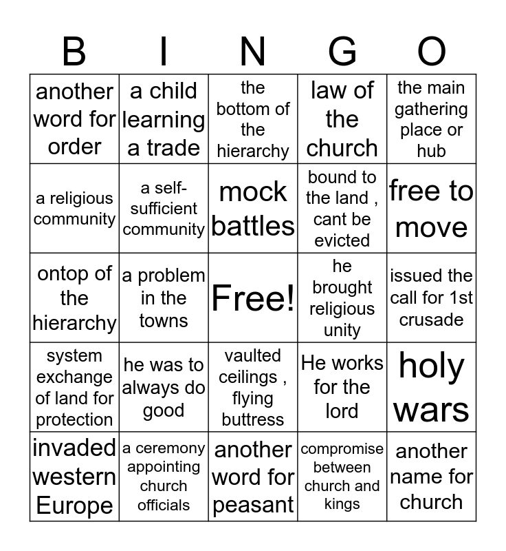 This bingo card has a free space and 24 words: invaded western Europe, he was to always do good, mock battles, compromise between church and kings, the main gathering place or hub, another word for order, a child learning a trade, the bottom of the hierarchy, he brought religious unity, issued the call for 1st crusade, ontop of the hierarchy, a self-sufficient community, He works for the lord, holy wars, a religious community, a ceremony appointing church officials, another word for peasant, law of the church, free to move, system exchange of land for protection, a problem in the towns, vaulted ceilings , flying buttress, bound to the land , cant be evicted and another name for church.