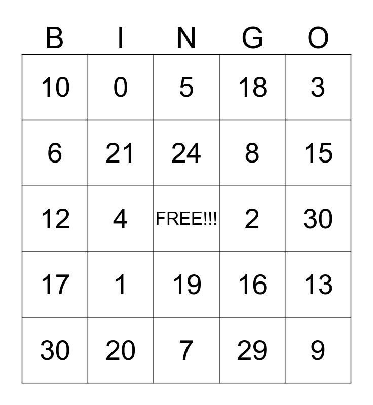 This bingo card has a free space and 24 words: 1, 20, 24, 30, 3, 10, 6, 0, 2, 19, 8, 12, 16, 13, 21, 29, 30, 5, 15, 4, 9, 17, 18 and 7.