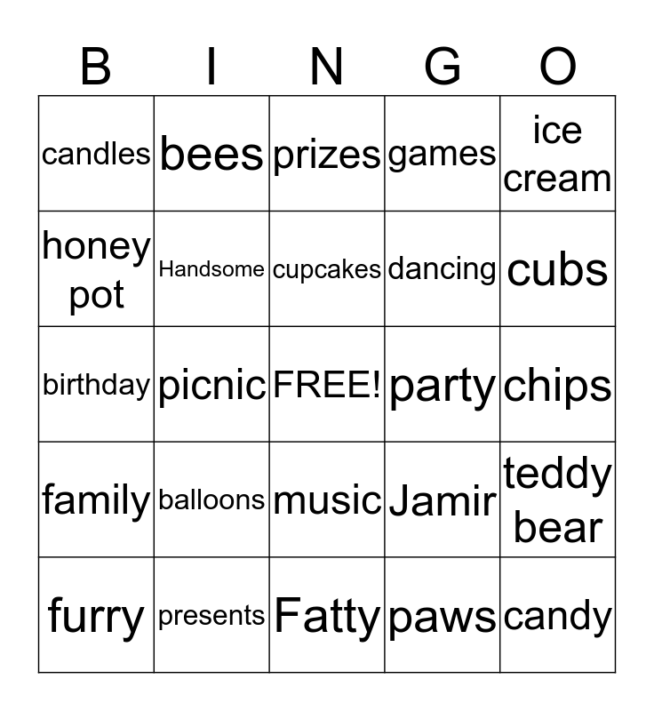 This bingo card has a free space and 24 words: balloons, presents, cupcakes, furry, ice cream, candles, honey pot, bees, party, music, dancing, birthday, Jamir, teddy bear, Handsome, paws, chips, prizes, cubs, picnic, candy, family, games and Fatty.