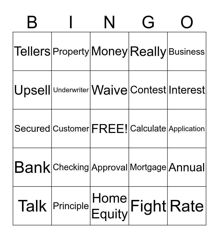 This bingo card has a free space and 31 words: Home Equity, Personal Loan, Customer, Questions, Tellers, Money, Underwriter, Mortgage, Calculate, Fight, Application, Rate, Years, Shadi, Interest, Um, Annual, Checking, Bank, Approval, Business, Nosy, Talk, Property, Contest, Upsell, Really, Secured, Principle, Waive and Product.