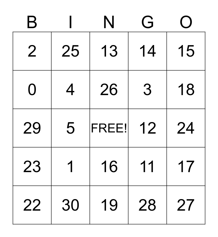 This bingo card has a free space and 24 words: 1, 30, 26, 22, 15, 2, 0, 25, 12, 16, 3, 29, 11, 17, 4, 28, 24, 13, 18, 5, 27, 23, 14 and 19.