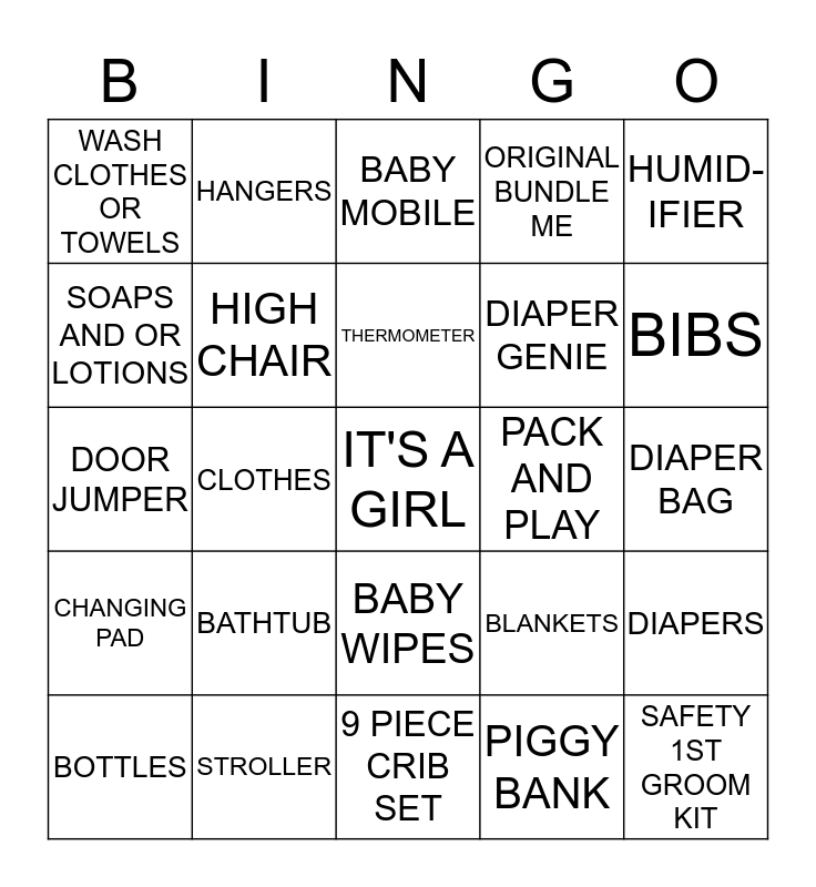This bingo card has a free space and 24 words: BATHTUB, STROLLER, THERMOMETER, BOTTLES, HUMID-IFIER, WASH CLOTHES OR TOWELS, SOAPS AND OR LOTIONS, HANGERS, PACK AND PLAY, BABY WIPES, DIAPER GENIE, DOOR JUMPER, BLANKETS, DIAPERS, HIGH CHAIR, PIGGY BANK, DIAPER BAG, BABY MOBILE, BIBS, CLOTHES, SAFETY 1ST GROOM KIT, CHANGING PAD, ORIGINAL BUNDLE ME and 9 PIECE CRIB SET.