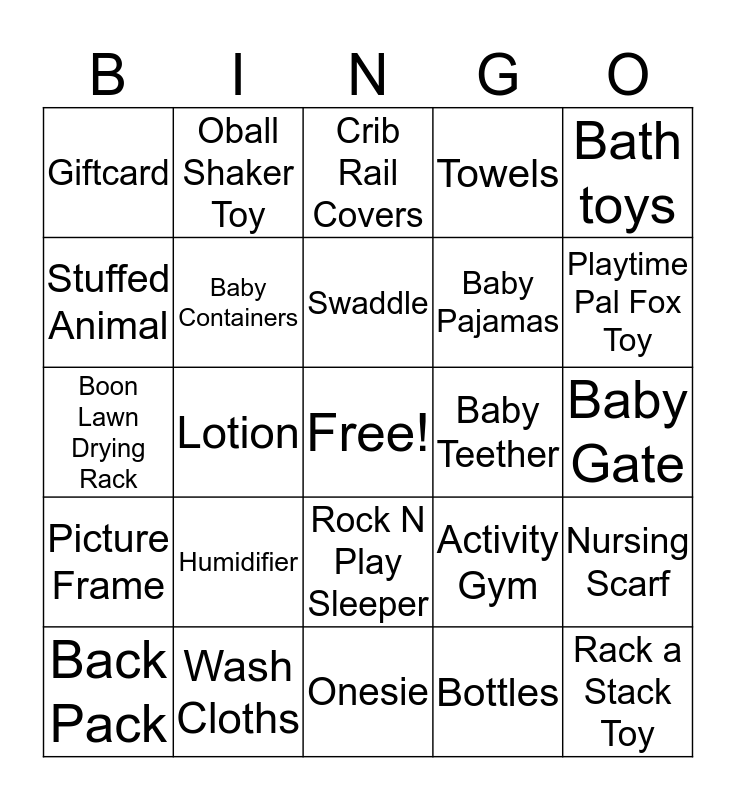 This bingo card has a free space and 44 words: Bathtub, Rack a Stack Toy, Pack N Play, Back Pack, Bottle Food warmer, Bottles, Crib Rail Covers, Bath mat, Bath toys, Wash Cloths, Towels, Baby Teether, Rock N Play Sleeper, Humidifier, Milestone Blanket, Onesie, Diaper Bag Refills, Boon Lawn Drying Rack, Bibs, Playtime Pal Fox Toy, Oball Shaker Toy, Blanket, Burp Cloths, Giftcard, Boppy, Baby Gate, Spoons, Bowls, Activity Gym, Picture Frame, Fitted Crib Sheet, Nursing Scarf, Stroller, Diaper Genie, Lotion, Socks, Soap, Shoes, Swaddle, Stuffed Animal, Baby Pajamas, Bassinet, Baby Containers and Pacifiers.