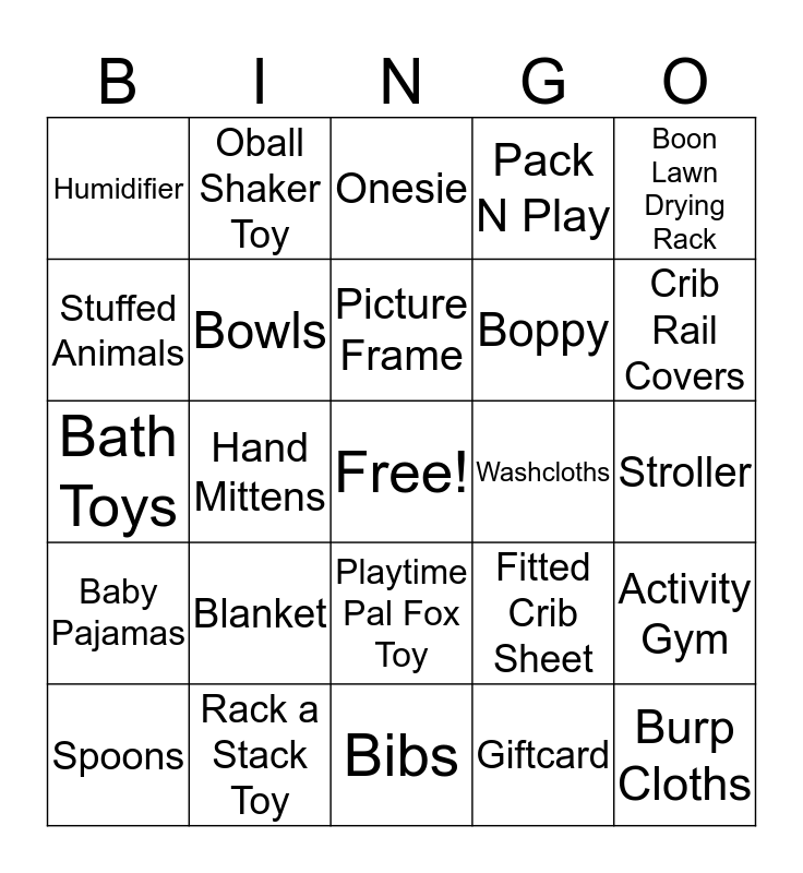 This bingo card has a free space and 44 words: Baby Teether, Burp Cloths, Milestone Blanket, Spoons, Baby Sleeper, Giftcard, Onesie, Diaper Bag Refills, Boon Lawn Drying Rack, Rack a Stack Toy, Pack N Play, Washcloths, Playtime Pal Fox Toy, Blanket, Bathmat, Bibs, Bottle Food Warmer, Bath Toys, Back Pack, Crib Rail Covers, Oball Shaker Toy, Bathtub, Bottles, Humidifier, Socks, Stroller, Swaddle, Baby Containers, Fitted Crib Sheet, Baby Pajamas, Nursing Scarf, Activity Gym, Soap, Pacifiers, Hand Mittens, Shoes, Bassinet, Baby Gate, Picture Frame, Stuffed Animals, Boppy, Lotion, Bowls and Diaper Genie.