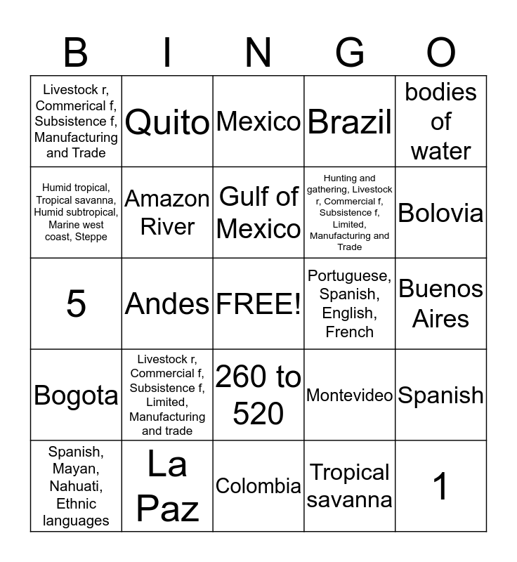 This bingo card has a free space and 24 words: Livestock r, Commercial f, Subsistence f, Limited, Manufacturing and trade, La Paz, Gulf of Mexico, Spanish, Mayan, Nahuati, Ethnic languages, bodies of water, Livestock r, Commerical f, Subsistence f, Manufacturing and Trade, Humid tropical, Tropical savanna, Humid subtropical, Marine west coast, Steppe, Quito, Portuguese, Spanish, English, French, 260 to 520, Hunting and gathering, Livestock r, Commercial f, Subsistence f, Limited, Manufacturing and Trade, 5, Montevideo, Spanish, Amazon River, Tropical savanna, Buenos Aires, Mexico, Bolovia, Andes, 1, Bogota, Brazil and Colombia.