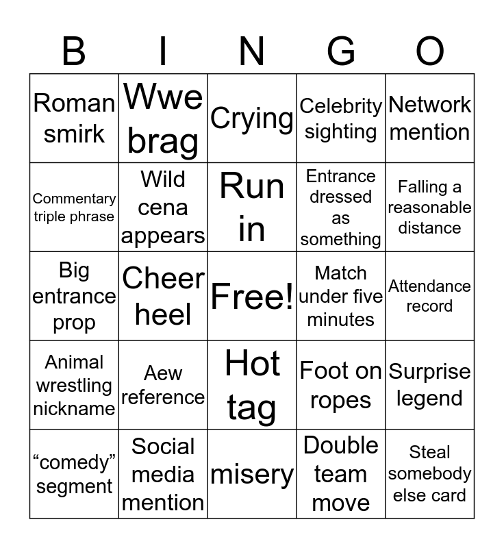 This bingo card has a free space and 26 words: Hot tag, Double team move, Run in, Social media mention, Network mention, Roman smirk, Commentary triple phrase, Wwe brag, Attendance record, Foot on ropes, Entrance dressed as something, Big entrance prop, Surprise legend, “comedy” segment, Cheer heel, Boo face, Celebrity sighting, Animal wrestling nickname, Crying, Steal somebody else card, Falling a reasonable distance, misery, Match under five minutes, Aew reference, Wild cena appears and Live music.