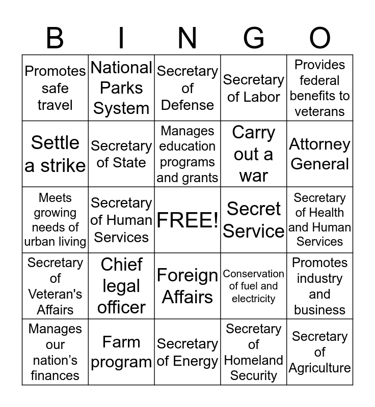 This bingo card has a free space and 24 words: Chief legal officer, Farm program, Manages education programs and grants, Manages our nation’s finances, Provides federal benefits to veterans, Promotes safe travel, Settle a strike, National Parks System, Secret Service, Foreign Affairs, Carry out a war, Meets growing needs of urban living, Conservation of fuel and electricity, Promotes industry and business, Secretary of State, Secretary of Homeland Security, Secretary of Health and Human Services, Secretary of Defense, Attorney General, Secretary of Human Services, Secretary of Agriculture, Secretary of Veteran's Affairs, Secretary of Labor and Secretary of Energy.