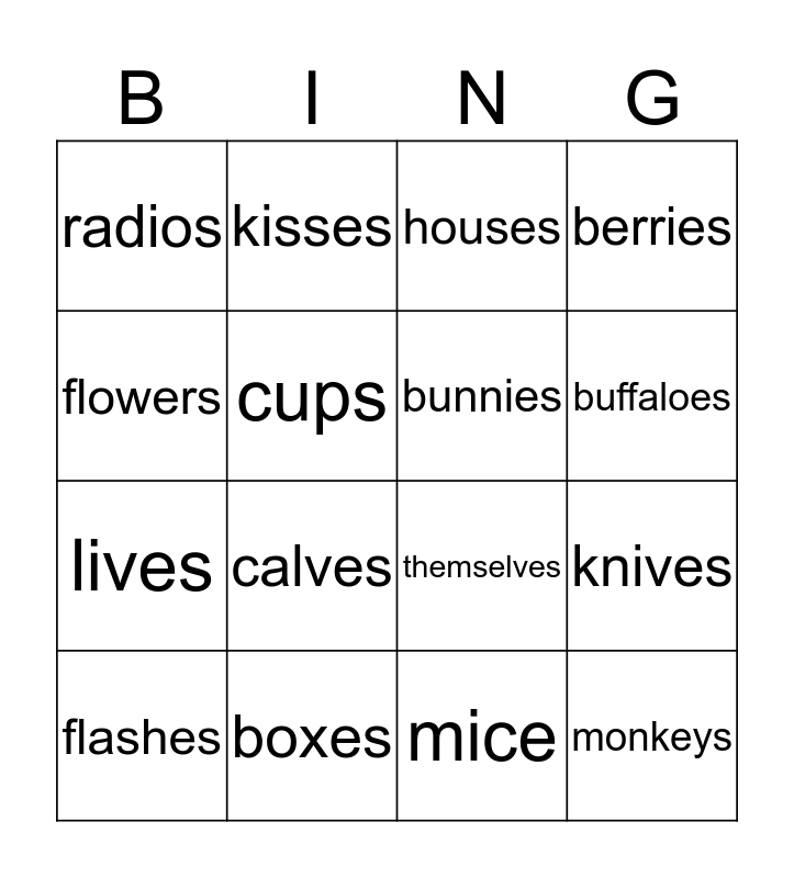 This bingo card has 24 words: babies, families, buffaloes, bags, flowers, radios, cups, kisses, boxes, elves, lives, themselves, drawers, skies, bunnies, fish, mice, houses, calves, knives, flashes, monkeys, berries and clocks.