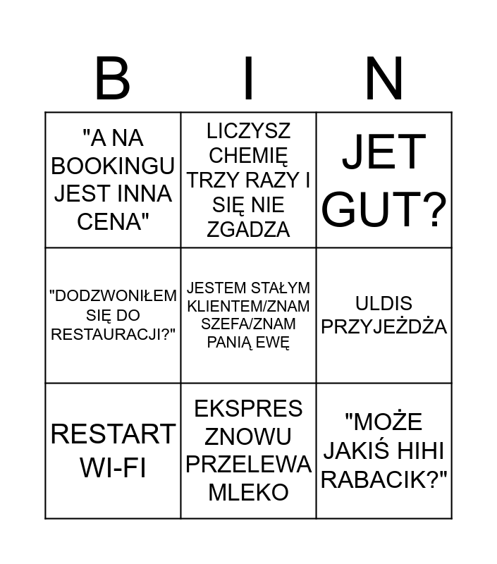 This bingo card has a free space and 10 words: EKSPRES ZNOWU PRZELEWA MLEKO, JET GUT?, "A NA BOOKINGU JEST INNA CENA", "MOŻE JAKIŚ HIHI RABACIK?", "DODZWONIŁEM SIĘ DO RESTAURACJI?", RESTART WI-FI, LICZYSZ CHEMIĘ TRZY RAZY I SIĘ NIE ZGADZA, PREZESI PRZESIADAUJĄ NA JADALNI DO 17, ULDIS PRZYJEŻDŻA and HAJS W KASIE SIĘ NIE ZGADZA.