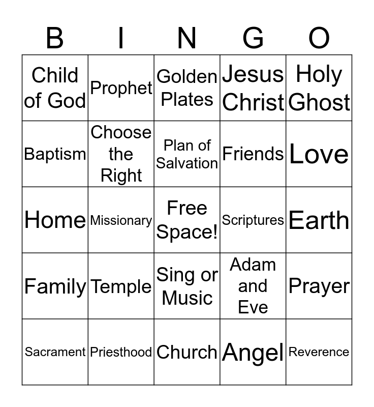 This bingo card has a free space and 24 words: Temple, Priesthood, Plan of Salvation, Sacrament, Holy Ghost, Child of God, Baptism, Prophet, Scriptures, Sing or Music, Friends, Home, Adam and Eve, Prayer, Choose the Right, Angel, Earth, Golden Plates, Love, Missionary, Reverence, Family, Jesus Christ and Church.