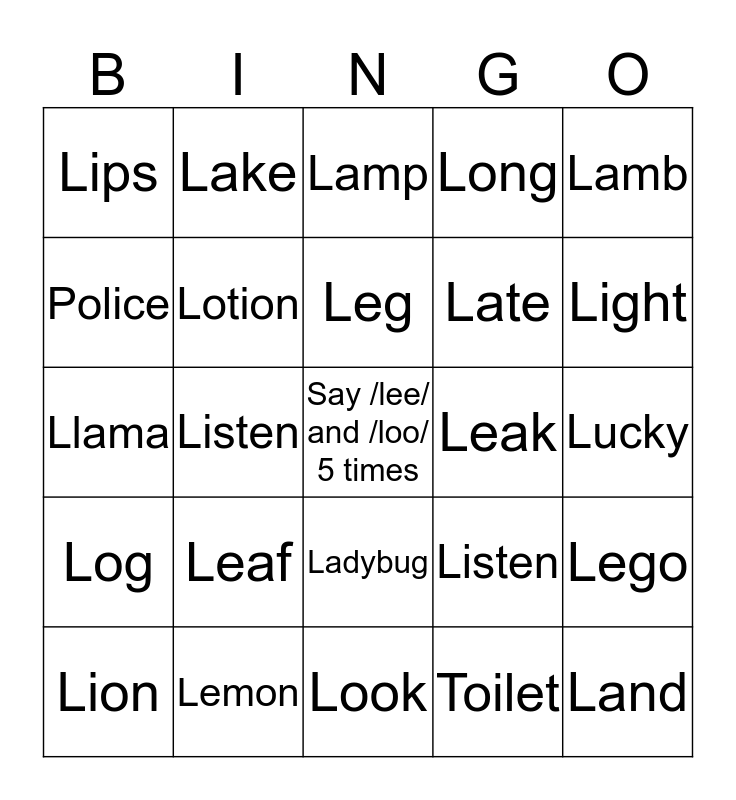 This bingo card has a free space and 25 words: Leaf, Look, Leg, Lion, Lamb, Lips, Police, Lake, Leak, Ladybug, Late, Llama, Listen, Lego, Lotion, Love, Lucky, Lamp, Light, Listen, Land, Lemon, Log, Long and Toilet.