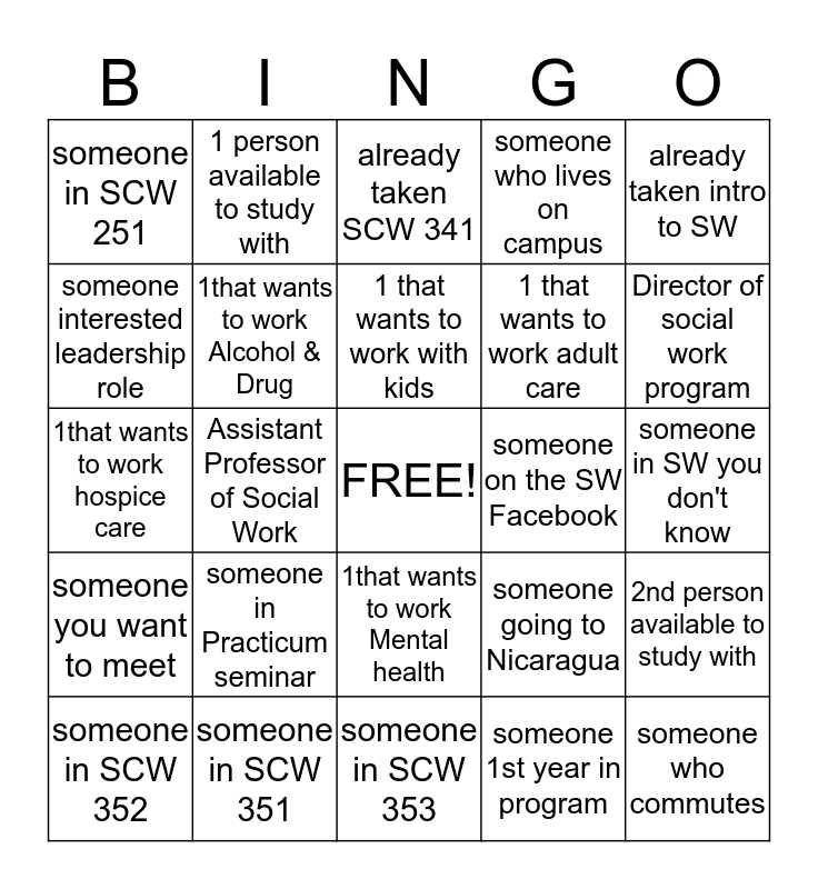 This bingo card has a free space and 24 words: someone in Practicum seminar, someone in SCW 351, 1 that wants to work with kids, someone in SCW 352, already taken intro to SW, someone in SCW 251, someone interested leadership role, 1 person available to study with, someone on the SW Facebook, 1that wants to work Mental health, 1 that wants to work adult care, 1that wants to work hospice care, someone going to Nicaragua, 2nd person available to study with, 1that wants to work Alcohol & Drug, someone 1st year in program, someone in SW you don't know, already taken SCW 341, Director of social work program, Assistant Professor of Social Work, someone who commutes, someone you want to meet, someone who lives on campus and someone in SCW 353.