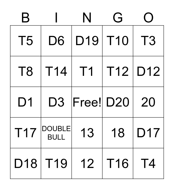 This bingo card has a free space and 61 words: T20, T19, T18, T17, T16, T15, T14, T13, T12, T11, T10, T9, T8, T7, T6, T5, T4, T3, T2, T1, D20, D19, D18, D17, D16, D15, D14, D13, D12, D11, D10, D9, D8, D7, D6, D5, D4, D3, D2, D1, SINGLE BULL, DOUBLE BULL, 20, 19, 18, 17, 16, 15, 14, 13, 12, 11, 10, 9, 8, 7, 6, 5, 4, 3 and 2.