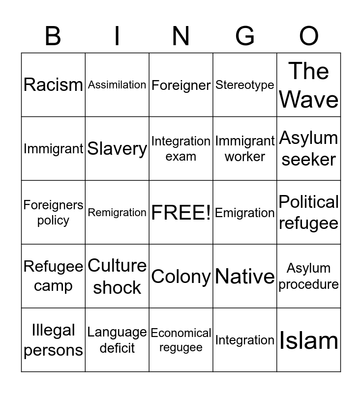 This bingo card has a free space and 24 words: Culture shock, Language deficit, Integration exam, Illegal persons, The Wave, Racism, Immigrant, Assimilation, Emigration, Colony, Immigrant worker, Foreigners policy, Native, Asylum procedure, Slavery, Integration, Political refugee, Foreigner, Asylum seeker, Remigration, Islam, Refugee camp, Stereotype and Economical regugee.