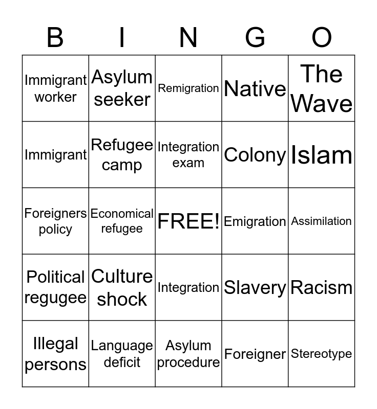 This bingo card has a free space and 24 words: Culture shock, Language deficit, Integration exam, Illegal persons, The Wave, Immigrant worker, Immigrant, Asylum seeker, Emigration, Integration, Colony, Foreigners policy, Slavery, Racism, Refugee camp, Foreigner, Assimilation, Remigration, Islam, Economical refugee, Stereotype, Political regugee, Native and Asylum procedure.