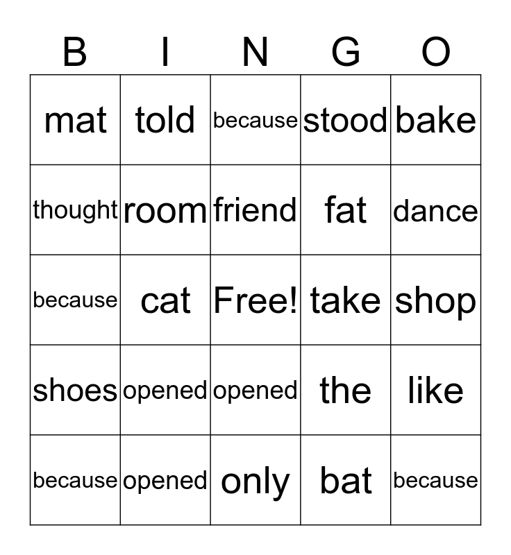 This bingo card has a free space and 49 words: across, because, dance, only, opened, shoes, told, picture, thought, remember, room, stood, like, the, this, that, friend, take, make, bake, cat, bat, mat, fat, a, dance, because, only, opened, shoes, told, across, danced, only, opened, shoes, told, them, shop, shake, stamp, skate, told, picture, because, because, only, laugh and know.