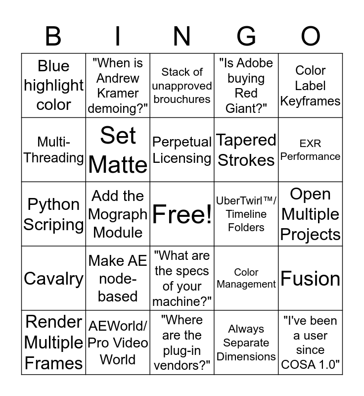 This bingo card has a free space and 24 words: Make AE node-based, AEWorld/ Pro Video World, Perpetual Licensing, Render Multiple Frames, Color Label Keyframes, Blue highlight color, Multi-Threading, "When is Andrew Kramer demoing?", UberTwirl™/ Timeline Folders, "What are the specs of your machine?", Tapered Strokes, Python Scriping, Color Management, Fusion, Set Matte, Always Separate Dimensions, Open Multiple Projects, Stack of unapproved brouchures, EXR Performance, Add the Mograph Module, "I've been a user since COSA 1.0", Cavalry, "Is Adobe buying Red Giant?" and "Where are the plug-in vendors?".